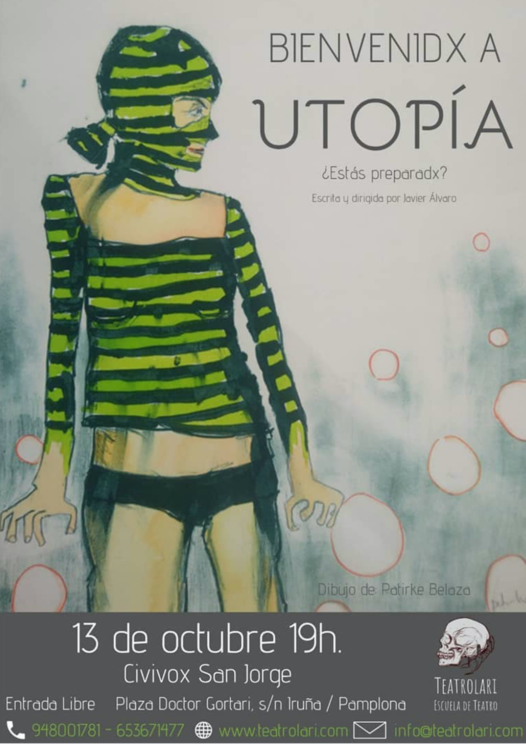 Antzerkia, interpretazioa, antzerki musikala, kameraren aurreko interpretazioa, clowna edo inprobisazioa modu ez profesionalean ikasi nahi baduzu, Teatrolari, gure eskola elkartuak arte dramatikoko hainbat ikastaro eskaintzen ditu Iruñeko eta Bilboko egoitzetan.